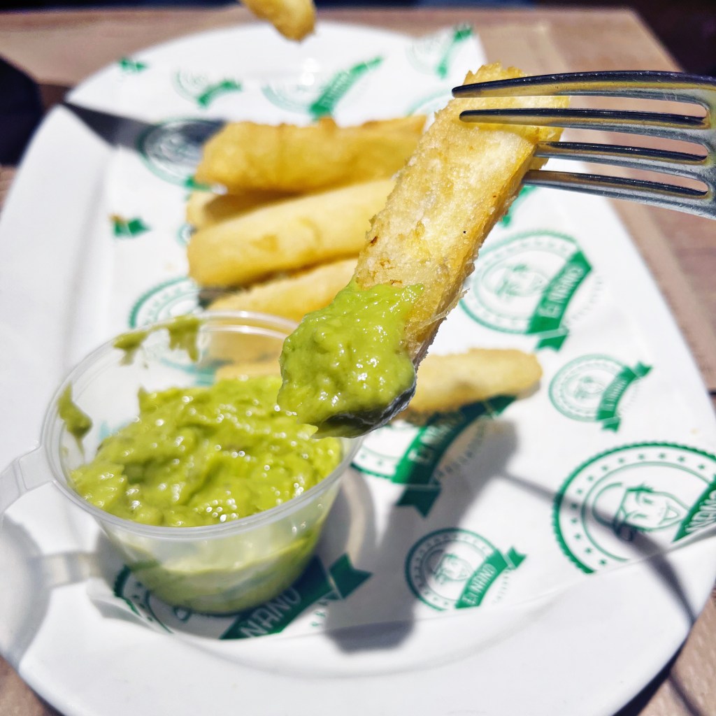 Para comenzar, disfrutamos de unas deliciosas yucas fritas, acompañadas de un pequeño recipiente de guacamole casero. La yuca, raíz vegetal almidonada originaria de América del Sur, me parece una mezcla entre la patata y la chirivía. Cuando se fríen, adquieren una textura perfecta: crujiente por fuera y tierna por dentro.